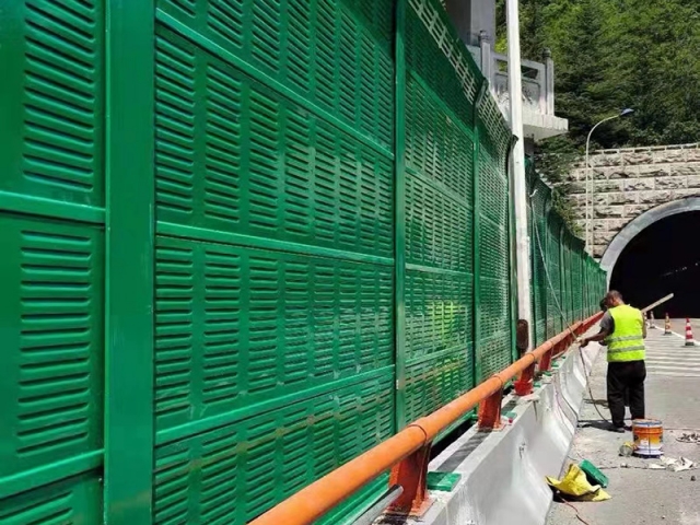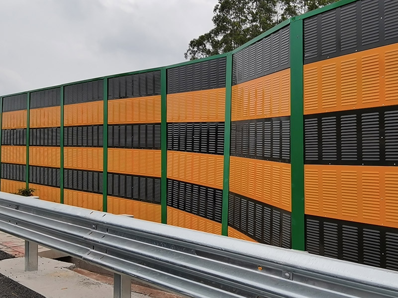 橋梁聲屏障是以吸聲材料為芯材,采用彩鋼夾芯板聲學構件組裝成的吸、隔聲屏障。彩鋼聲屏障吸聲型聲學構件可加工成百頁窗式、穿孔式、微穿孔式和開槽孔式等若干種吸、隔聲型聲學單元。百葉窗和穿孔的吸聲彩鋼復合板中、高頻隔聲性能較好,不開槽孔的彩鋼復合板聲學構件對中、低頻隔聲性能較好。因此可根據噪聲特點選用不同結構形式的聲屏障。